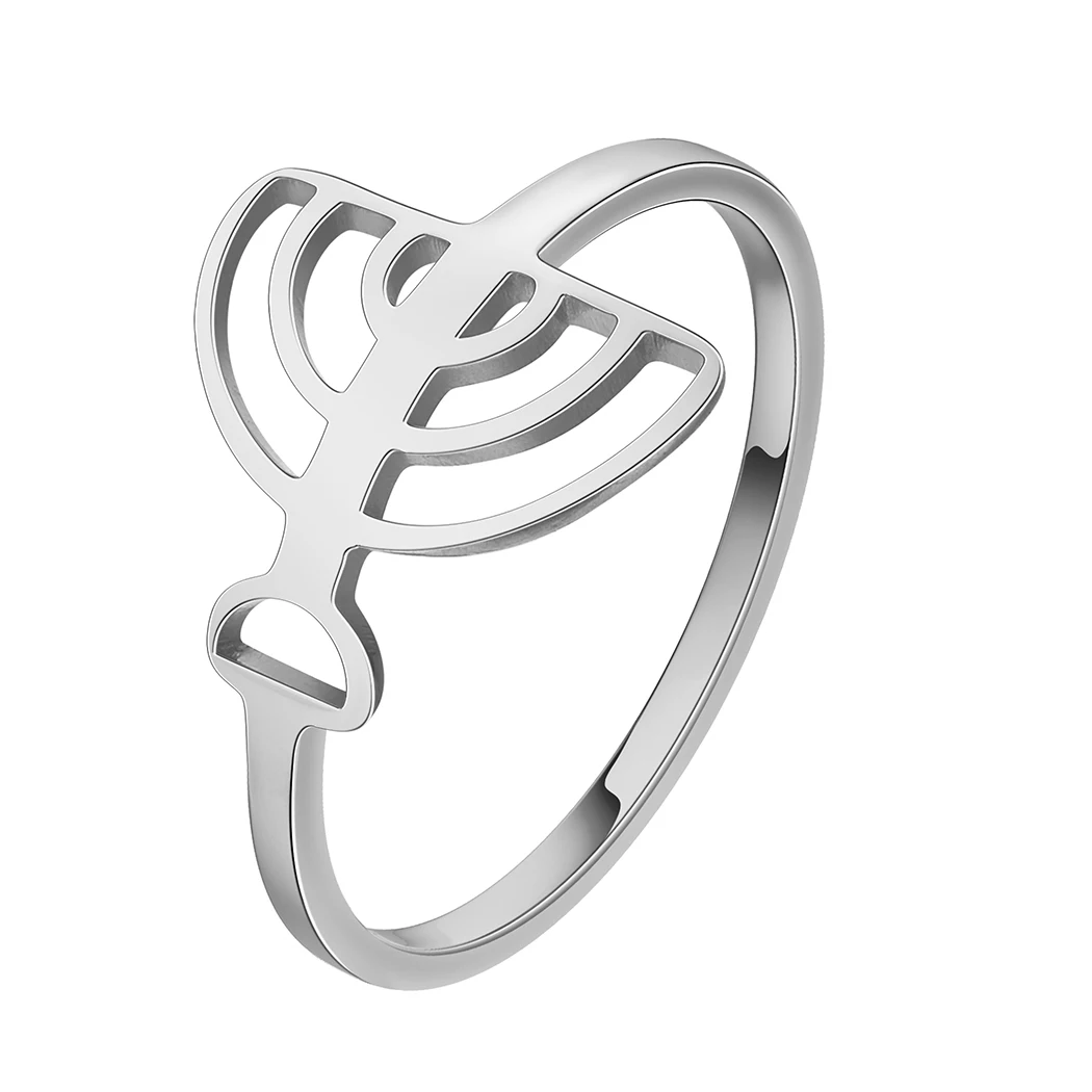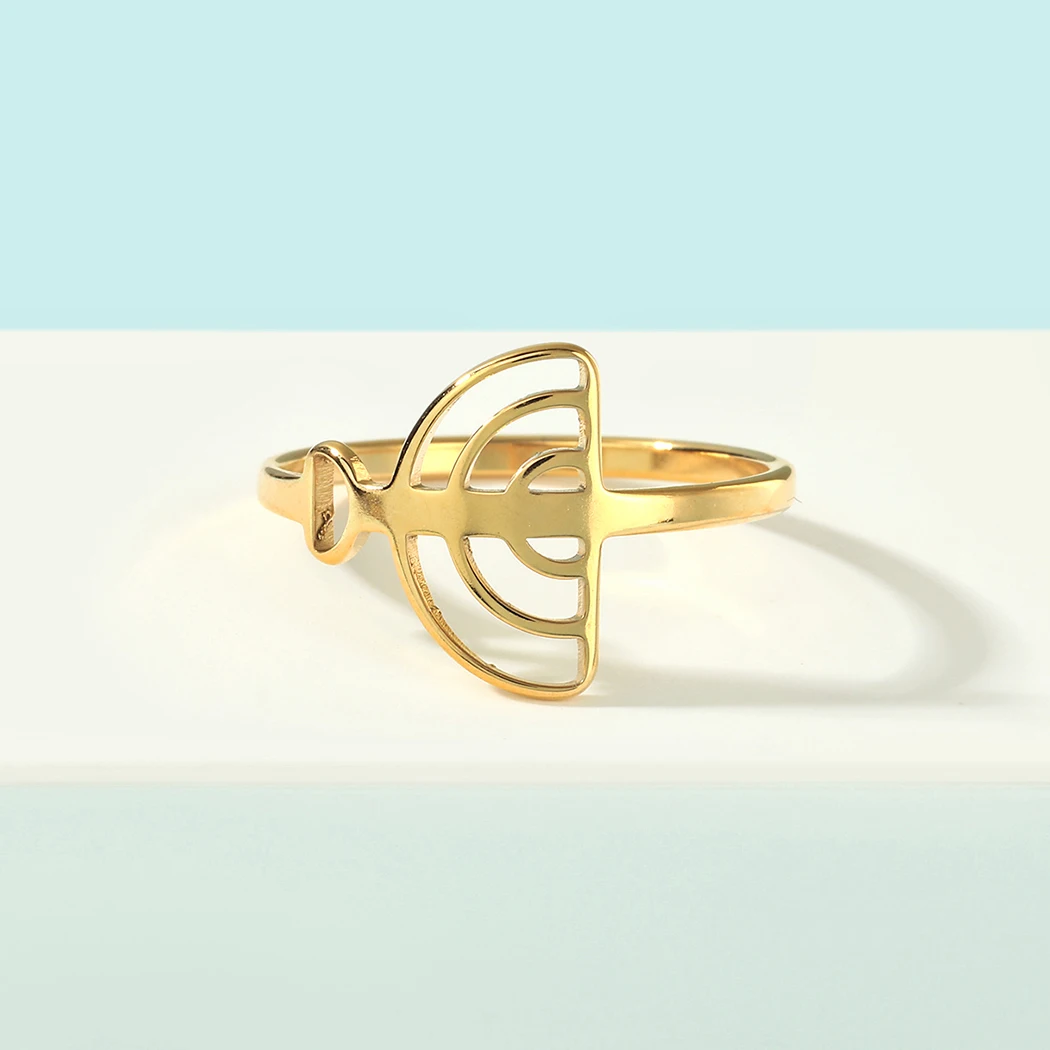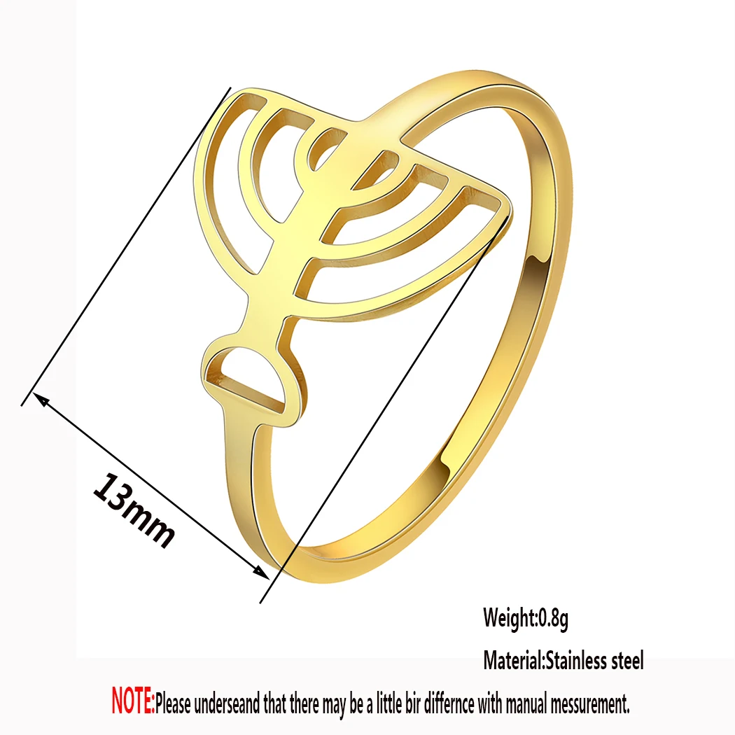 טבעת נירוסטה איכותית בציפוי צבע זהב איכותי. כוללת תבנית מנורת בית המקדש מניאטורית.